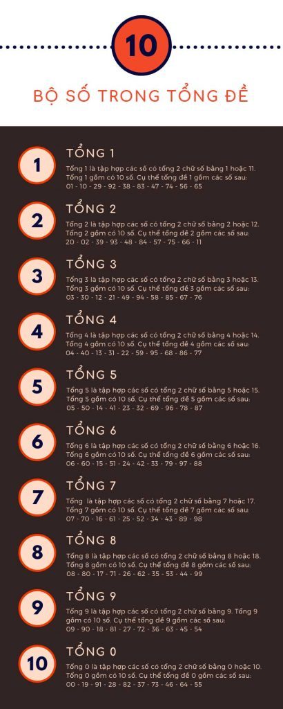 Trước khi biết các kinh nghiệm chơi dàn lô đề theo tổng anh em cần biết danh sách tổng trong lô đề. Hãy ghi nhớ các tổng đề sẽ giúp cho việc soi cầu trở nên dễ dàng hơn. Cụ thể: